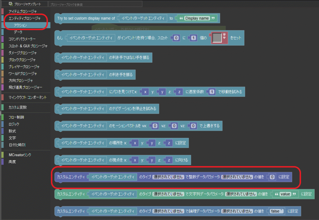 エンティティプロシージャのアクションから、データパラメータを設定するプロシージャを持ってきます。