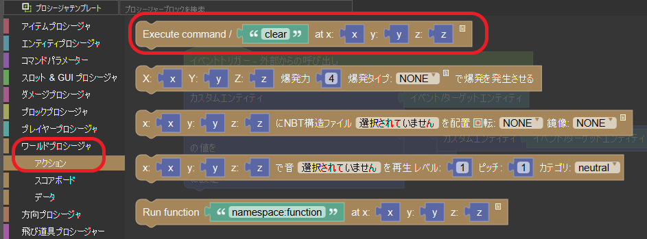 ワールドプロシージャのアクションから、コマンドを実行するプロシージャを持ってきます。