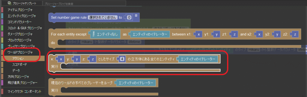 ワールドプロシージャのアクションから、範囲内のエンティティに対して実行するプロシージャを持ってきます。