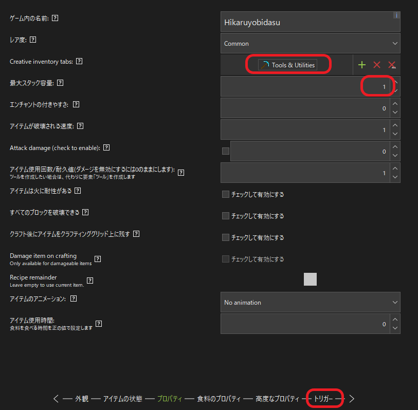 クリエイティブタブと、最大スタック容量を設定し、トリガーに移動します。