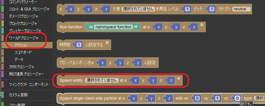 ワールドプロシージャのアクションから、エンティティをスポーンするプロシージャを持ってきます。