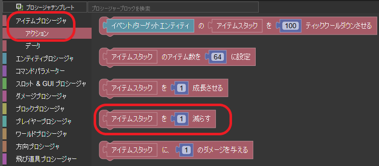 アイテムプロシージャのアクションから、アイテムスタックを減らすプロシージャを持ってきます。