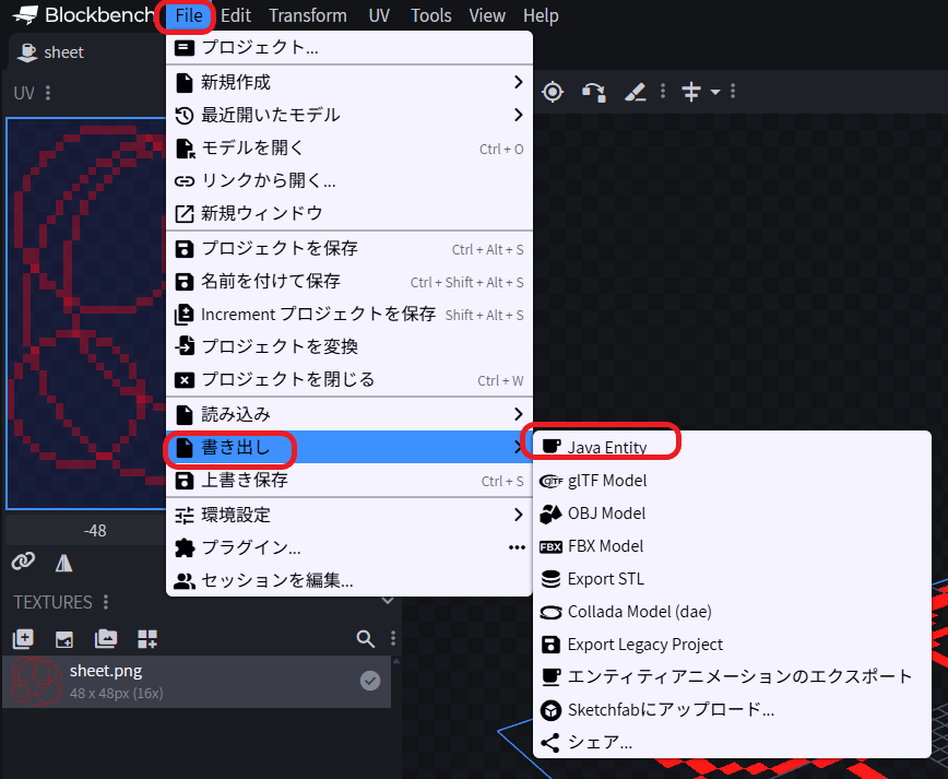 File、書き出し、Java Entityでモデルを出力します。テクスチャも出力しておきます。