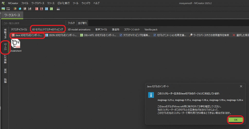 MCreatorに移動し、リソース、3DモデルとテクスチャのマッピングでJava 3Dモデルをインポートします。
