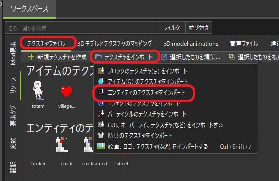 テクスチャファイルに移動し、エンティティのテクスチャもインポートします。